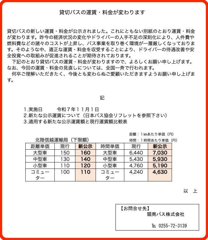 令和7年11月1日より貸切バス運賃・料金が変わります